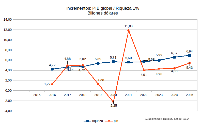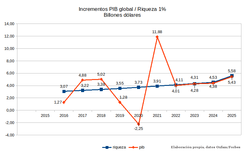 La evidencia es contundente: el crecimiento no beneficia al conjunto de la sociedad (el símil de que la marea sube a todos los barcos, no es cierta), sino que engorda el patrimonio de los más ricos. De hecho, otras investigaciones como las del World Inequality Database (WID) muestran que la riqueza en el periodo 2015-2025 del 1% creció incluso más que en el informe de Oxfam (1), todo ello implica que el 99% perdió (de forma absoluta y relativa) participación en la riqueza global.