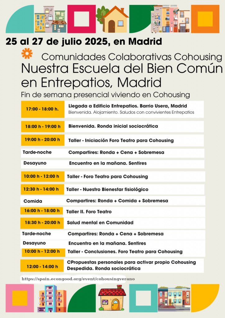Ya tenemos en marcha la lista de asistentes a nuestras "Vacaciones Comunidades Colaborativas del Bien Común" en el edificio Cohousing de Entrepatios en Usera, Madrid, los días 25 al 27 de julio, en fin de semana. Si eres socios de la EBC es posible que llegues a tiempo para sumarte. Puedes enviarnos este formulario : https://forms.gle/efjJtHrf5yukprwJ6 … Sigue leyendo CohousingVerano
